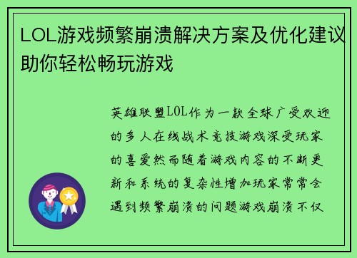 《英雄联盟》(LOL)作为一款全球广受欢迎的多人在线战术竞技游戏,深受玩家的喜爱。然而,随着游戏内容的不断更新和系统的复杂性增加,玩家常常会遇到频繁崩溃的问题。游戏崩溃不仅影响游戏体验,还会造成玩家情绪波动,甚至影响到比赛结果和排位进程。因此,解决LOL游戏频繁崩溃的原因并进行相应的优化已成为玩家关注的重点。本文将从四个方面详细分析LOL游戏频繁崩溃的解决方案及优化建议,帮助玩家轻松畅玩游戏。四个方面分别是:硬件和驱动更新、游戏客户端设置、网络优化和系统清理与维护。通过本文的详细阐述,玩家将能够有效减少游戏崩溃的频率,提升游戏体验。